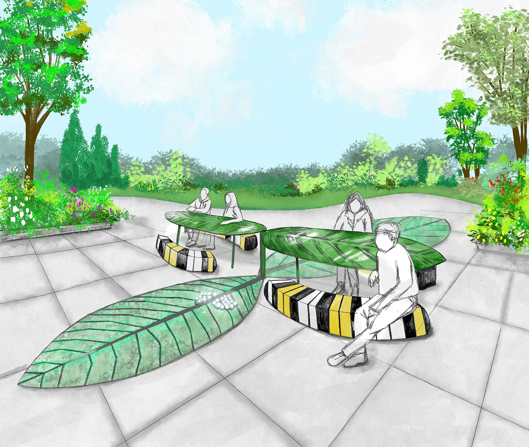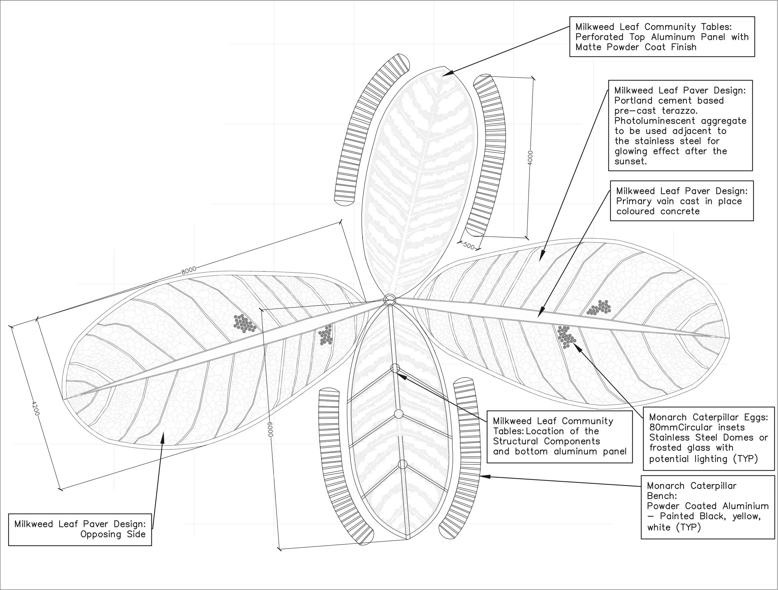 Designed for a trail where milkweed grows abundantly, the installation features leaf-shaped pavers and elevated community tables, accompanied by caterpillar-shaped benches. Together, these elements reference the monarch lifecycle while creating a space for rest and gathering, highlighting the importance of habitat and the fragile conditions that support it.